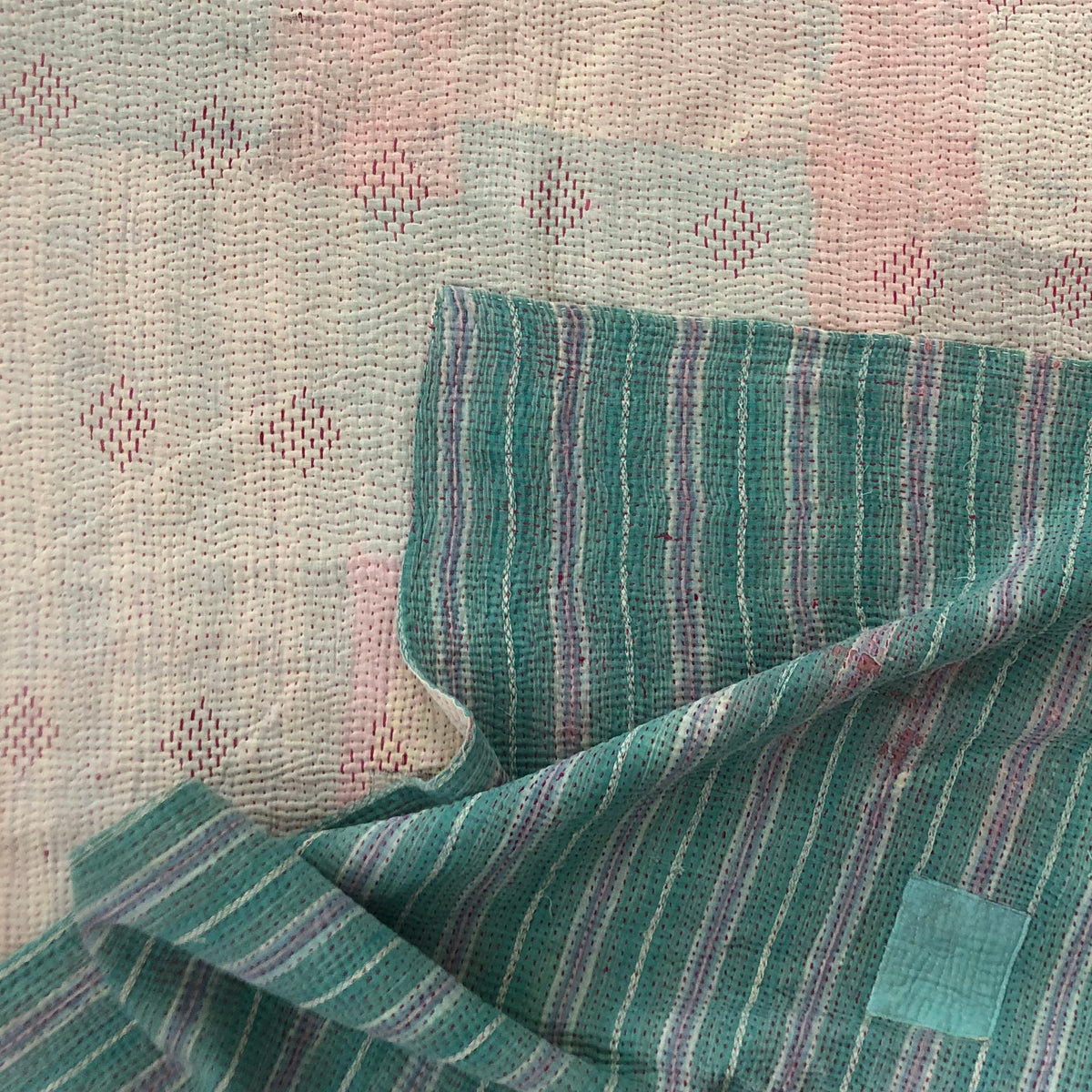 Multi layered vintage quilts with hand-embroidered traditional kantha stitch.