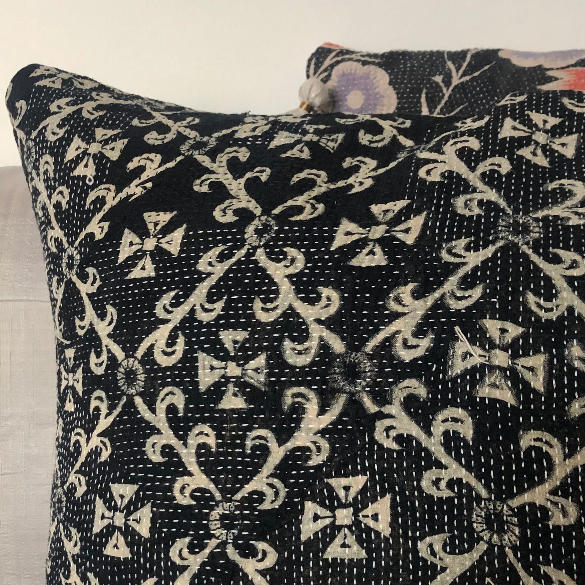 Multi-layered cushion cover with hand-embroidered traditional kantha stitch on both sides. Each cushion cover is unique and made of old cotton saris from India. Only four cushions can be cut and stitched from each vintage throw.