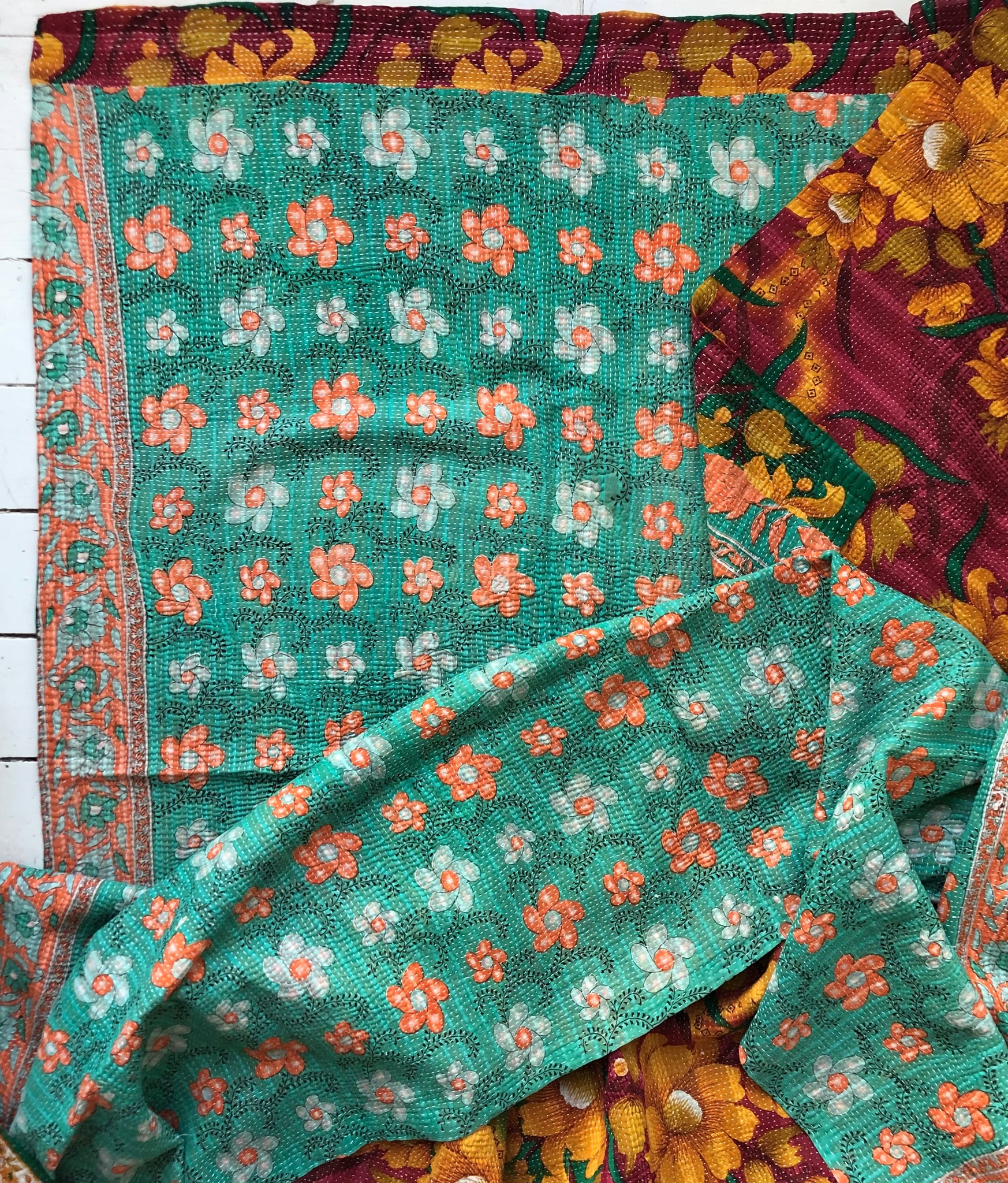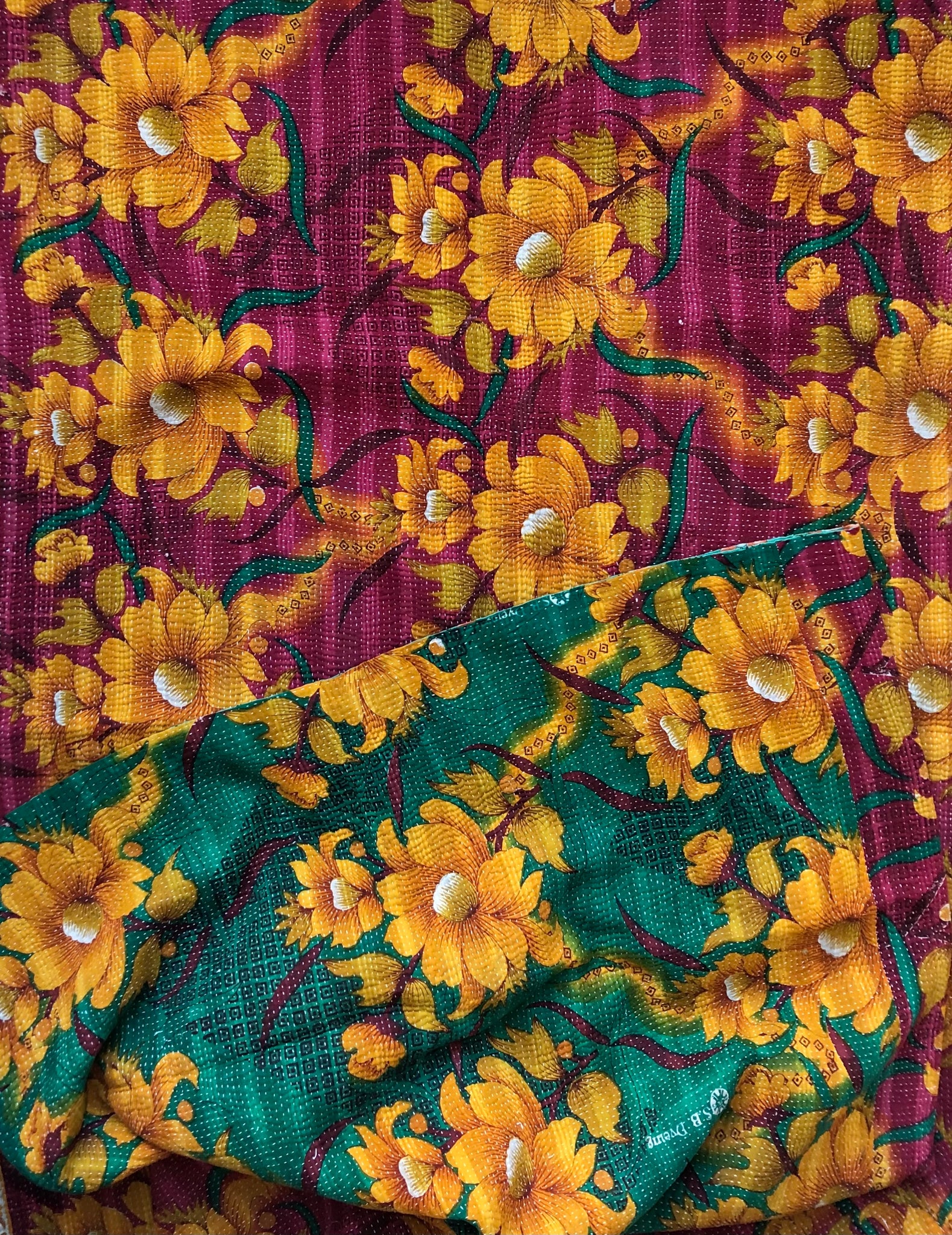 Each throw is unique, made of old cotton saris and hand-picked by myself in India. This kantha piece is unusually large. It features a warm saffron yellow flower print on green and fuchsia pink on one side, and on the other a retro inspired smaller flower design in orange and aqua green shades.